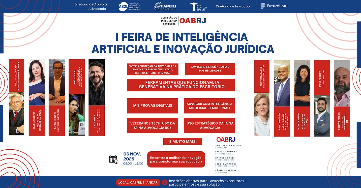 Nesta quinta-feira, 06.11, acontece a I Feira de Inteligência Artificial e Inovação Jurídica, um encontro inédito que vai reunir advogados, empreendedores, magistrados e profissionais da tecnologia para discutir o futuro da advocacia e conhecer soluções que já estão transformando o mercado jurídico.
